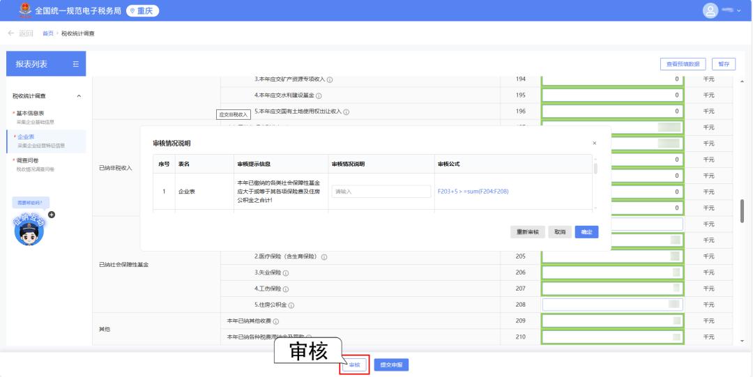 全部报表填写完整后,点击下方【审核】按钮。如界面显示审核通过,直接点【提交】即可,报表填写流程结束。如弹出“审核情况说明”界面,请按照审核提示的内容,继续补充填报数据、修改数据,直到“审核通过”。