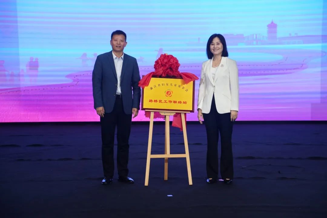 省妇女儿童基金会副理事长、秘书长冯志刚,区妇联党组书记、主席汪文菊共同为浙江省妇女儿童基金会路桥联络站揭牌。