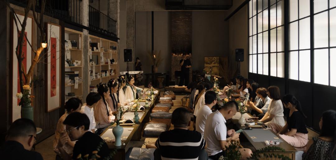 2023年,何松波在文昌里1950文创园开出了这间宋韵风格的新中式茶饮工作室。他告诉记者,去年夏天,每天都有成群结队来打卡的年轻人走进店里,他没想到自己设计的工作室这么受欢迎,“对年轻人来说,在一个新场景里拍一组照片,和以前逛街的形式是一样的。我们就提供这样一个环境,让他们感觉轻松、放松下来。”