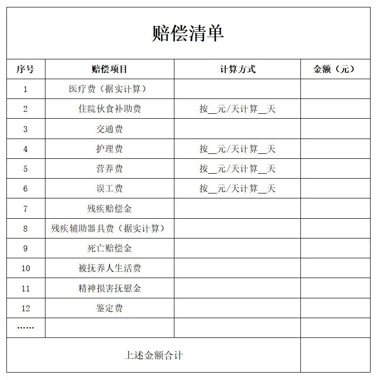 应写明原告请求被告赔偿的全部金额。请求赔偿的详细类目在赔偿清单上据实写明。
