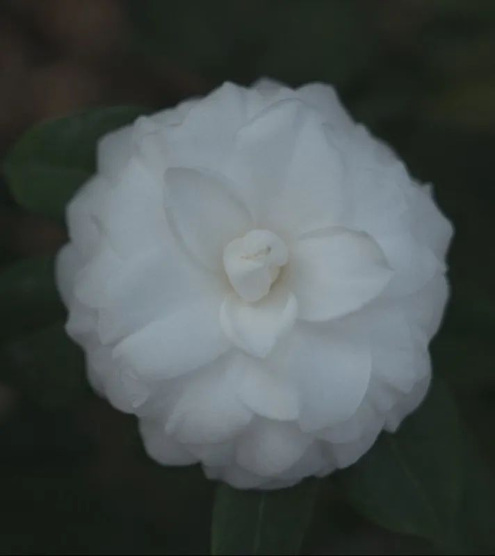 花:花朵洁白,花瓣先端有“V”型缺口,完全重瓣型,花瓣覆瓦状排列,瓣缘略外翻,花心常现绿晕,中型花,花量中等,花期11月-翌年4月。