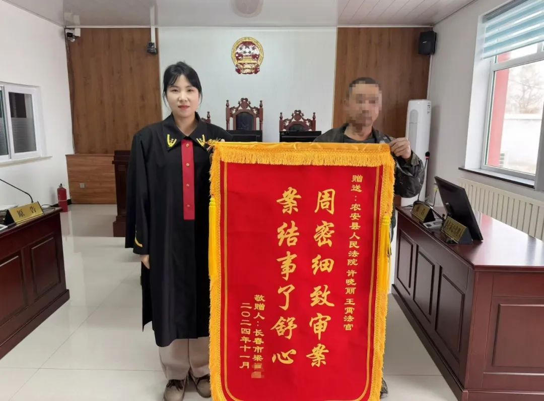 图为当事人梁某向法官许晓丽、法官助理王霄赠送锦旗