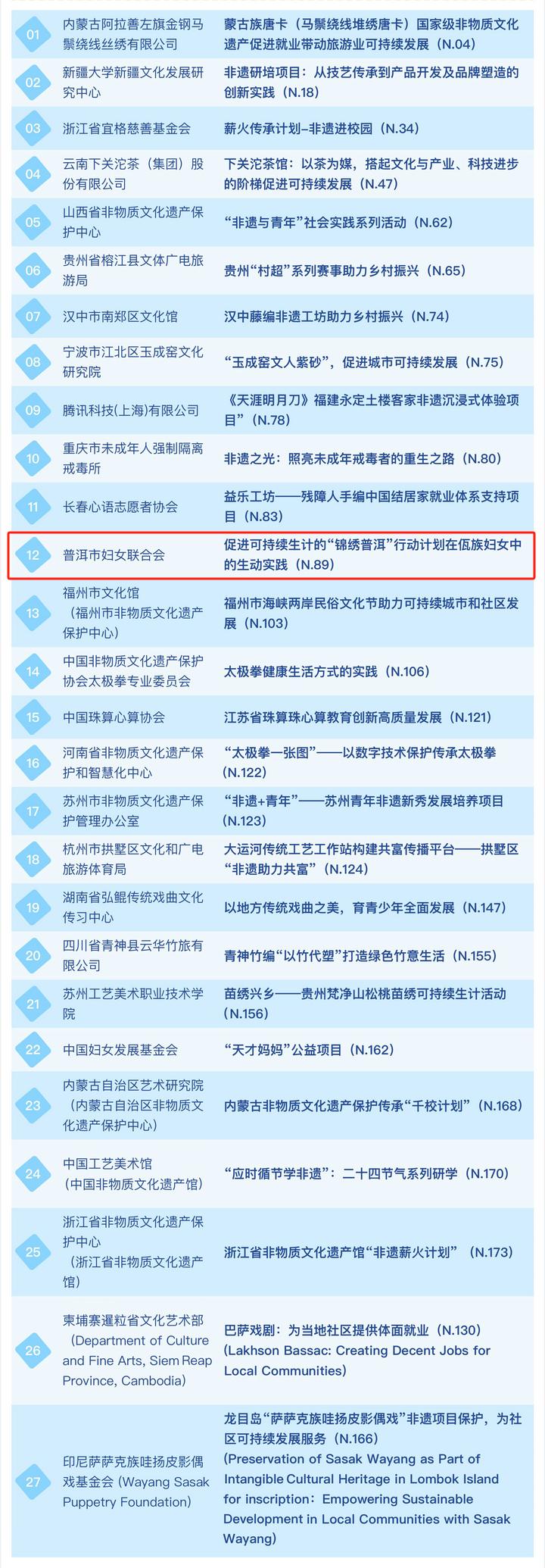 2024年度亚太地区“非物质文化遗产促进可持续发展”案例征集和评选由联合国教科文组织亚太地区非物质文化遗产国际培训中心(CRIHAP)、联合国教科文组织亚太地区非物质文化遗产国际研究中心(IRCI)、联合国教科文组织亚太地区非物质文化遗产国际信息与网络中心(ICHCAP)联合主办,共征集到亚太地区申报的200多个项目。普洱市妇女联合会申报的“促进可持续生计的‘锦绣普洱’行动计划在佤族妇女中的生动实践”脱颖而出,入选成为27个案例之一。