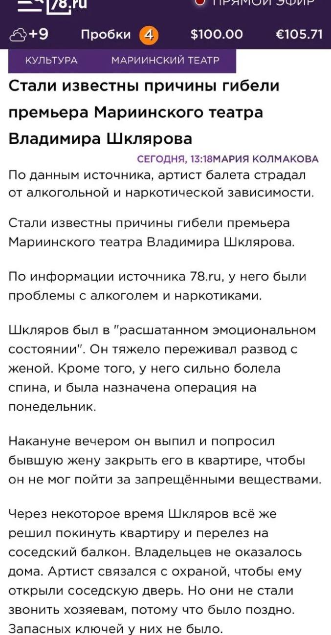 马林斯基剧院发言人安娜·卡萨特金娜则表示,什克利亚罗夫是从一栋大楼五楼坠落身亡。圣彼得堡调查委员会称,坠落事件被认为是意外,但具体原因仍在调查当中。