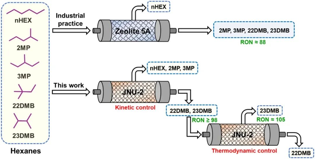 本工作利用单一吸附剂协同热力学控制和动力学控制逐步分离线性、单支链和双支链己烷异构体,最重要的是,本工作首次实现了22DMB与23DMB两种相似异构体的分离,进一步提高了RON值(RON≈105),为设计可应用于汽油工业生产的新型MOF材料提供了新的思路与方法。