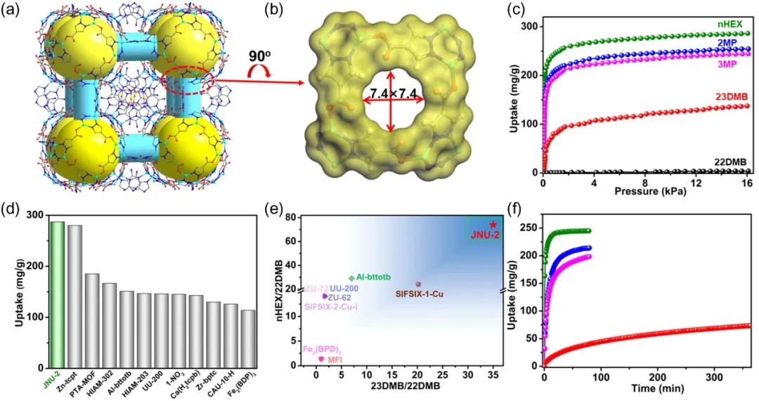 单晶X射线研究表明,JNU-2的晶体结构为通道-孔互连的三维(3D)网络,大孔通过通道相连,且通道-孔连接处的开口尺寸为7.4×7.4 Å⊃2;。气相平衡吸附等温线显示,在353 K和16 kPa条件下,JNU-2能够完全排斥尺寸稍大的22DMB,同时对nHEX、2MP、3MP和23DMB的吸附量较高,其中nHEX在353 K下的吸附容量为286 mg g⁻⊃1;。此外,JNU-2对23DMB/22DMB和nHEX/22DMB的吸附比显著高于目前报道的用于己烷异构体分离的高性能MOF材料。值得注意的是,JNU-2表现出对23DMB和22DMB罕见的筛分效果。为进一步评估JNU-2在分离23DMB与直链及单支链烷烃异构体中的潜力,我们测量了nHEX、2MP、3MP和23DMB在10 kPa和353 K下的吸附动力学,结果显示23DMB在JNU-2中的扩散速度相对较慢。上述研究证明了JNU-2具备将双支链烷烃从己烷异构体混合物中分离,并进一步区分23DMB和22DMB的潜力。