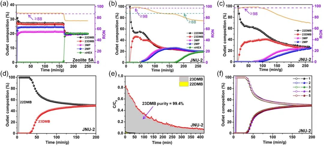 为了验证JNU-2协同利用吸附动力学和热力学控制逐步分离己烷异构体的可行性,作者进行了等摩尔nHEX/2MP/3MP/22DMB/23DMB混合物在高流速(10 mL min⁻⊃1;)和等摩尔23DMB/22DMB混合物在低流速(3 mL min⁻⊃1;)下的穿透实验。在高流速实验中,引入了5A沸石作为对照,结果表明5A沸石只能从五组分混合物中分离出直链nHEX,得到RON值为88的流出物。而JNU-2能够将双支链(23DMB,22DMB)从直链 (nHEX)、单支链(2MP,3MP)中分离出来,在3MP流出前能收集到RON值超过98的流出物。在低流速实验中,22DMB几乎立即突破色谱柱,而23DMB则在约34 min g⁻⊃1;后才突破色谱柱,经过氦气吹扫后可获得纯度为99.4%的23DMB,混合物RON值约为105。此外,循环穿透实验显示出良好的重现性,证明了JNU-2具有优异的可回收性。