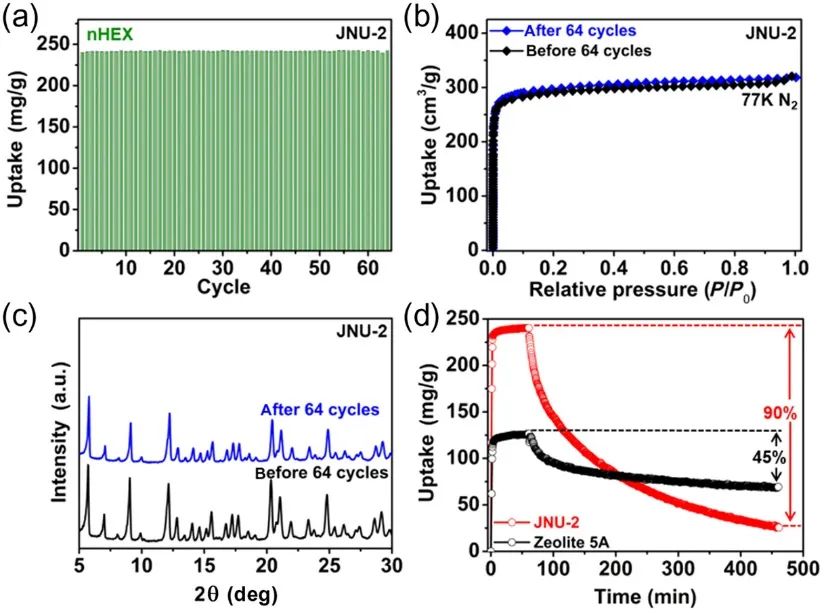 为进一步验证JNU-2的工业适用性,作者对nHEX、2MP和3MP进行了连续的原位重量吸附/解吸测试。结果显示,nHEX在经历多达64次吸附/解吸循环后,其吸附容量几乎没有变化。此外,循环实验结束后JNU-2的77 K N₂吸附等温线和PXRD谱图与循环前基本一致。与5A沸石的原位重量分析相比,JNU-2在吸附容量和解吸效率方面均表现出明显优势。其高稳定性及较低能耗的解吸过程进一步证明了JNU-2在工业应用中的潜力。