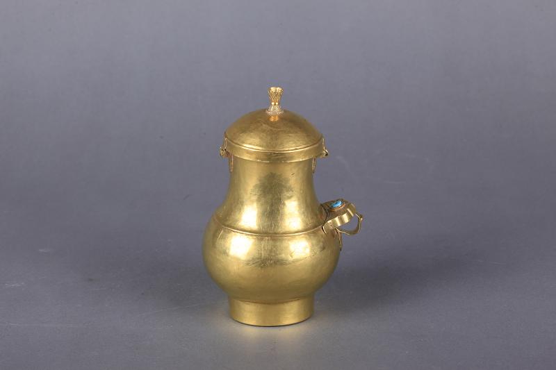 单耳带盖镶珠金壶:1979年出土于肃南县马蹄乡嘉卜斯村大长岭坡的吐蕃时期墓葬。通高17.5厘米,口径6.5厘米,底径6.5厘米,重709克。直口、卷沿、溜肩、鼓腹、平底。圆拱盖中央焊一莲花纹杯形纽,纽上镶一颗圆形绿松石。壶肩部有凸弦纹一周,腹部铆二菱花形横耳,下连一单耳,横耳中央镶有两颗圆形绿松石。金壶的制作工艺精湛,运用了切削加工、抛光、焊接、铆固、镶嵌等多种工艺。金壶的造型独特,融合了吐蕃文化与其他文化的元素,展现出多元文化交融的特点。它是吐蕃时期的重要文物,见证了公元7至9世纪吐蕃在河西走廊的活动与文化遗留,为研究吐蕃的历史、文化、艺术以及与周边地区的交流提供了珍贵的实物资料。