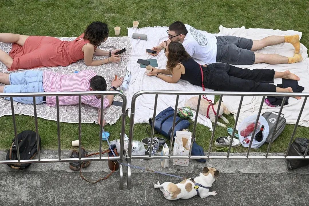 2022年6月3日,上海徐汇滨江,游客牵着小狗,趴在垫子上休息。澎湃新闻记者 朱伟辉 资料图