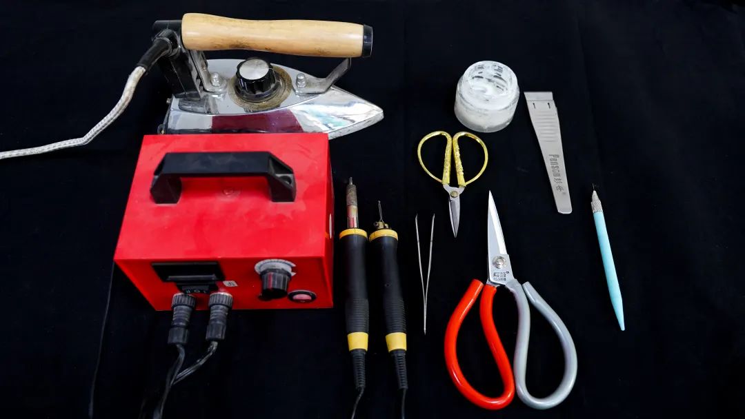 制作一幅作品,要使用电烙铁、电熨斗、雕刻刀、剪刀、夹子等,剪刀分为平口型、锯齿型、月牙型等工具,经历割、捡、漂、刮、碾、拓、剪、编、刻、裱、贴、烫、烙、熏等十几道工序。