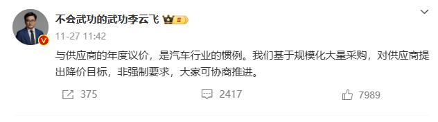 对此,比亚迪集团品牌及公关处总经理李云飞回应称,“与供应商的年度议价,是汽车行业的惯例。我们基于规模化大量采购,对供应商提出降价目标,非强制要求,大家可协商推进。”