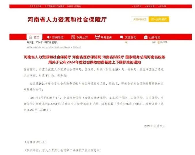 2024年7月至2025年6月,全省社会保险(含基本养老保险、基本医疗保险、工伤保险、失业保险、生育保险)缴费基数以6260元/月确定个人缴费基数上下限,缴费基数下限为3756元(60%),缴费基数上限为18780元(300%)