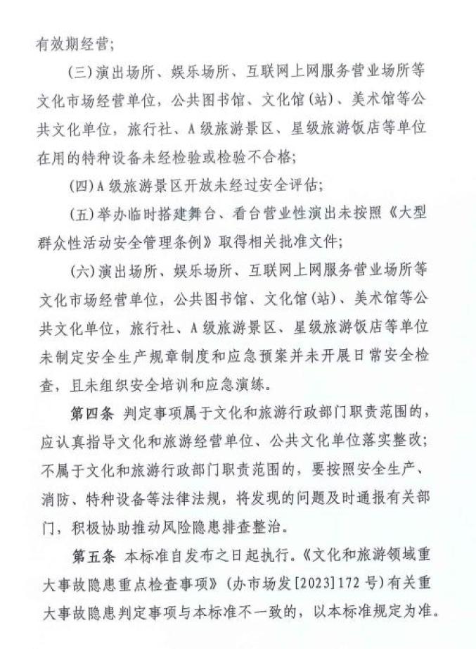 第五条 本标准自发布之日起执行。《文化和旅游领域重大事故隐患重点检查事项》(办市场发〔2023〕172号)有关重大事故隐患判定事项与本标准不一致的,以本标准规定为准。