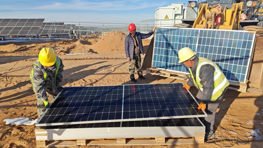 “我们项目整体进度已完成80%,目前工人们正在进行剩余的光伏板安装作业。升压站工程土建工程已全部完工,正在进行设备安装。整体项目争取在2025年3月进行并网。”项目技术负责人郭瑞斌说。