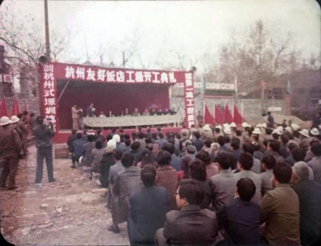 杭州市饮服务公司领导,特地在华侨饭店摆了好几桌“庆功酒”,祝贺友好饭店结顶、塔吊安全顺利拆除。