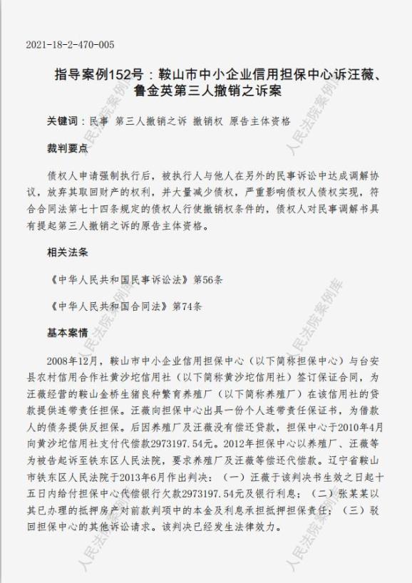 人民法院指导案例152号:鞍山市中小企业信用担保中心诉汪薇、鲁金英第三人撤销之诉案。裁判要点:债权人申请强制执行后,被执行人与他人在另外的民事诉讼中达成调解协议,放弃其取回财产的权利,并大量减少债权,严重影响债权人债权实现,符合合同法第七十四条规定的债权人行使撤销权条件的。债权人对民事调解书具有提起第三人撤销之诉的债权人主体资格