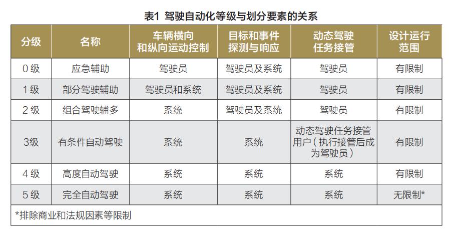 2022年3月1日,推荐性国家标准《汽车驾驶自动化分级》(GB/T40429—2021)正式实施,解决了我国汽车驾驶自动化分级的规范性问题。该国标是基于驾驶自动化系统能够执行动态驾驶任务的程度,根据在执行动态驾驶任务中的角色分配以及有无设计运行范围限制,将自动化分成0级至5级,具体见表1。此外,该国标从3级自动驾驶开始,目标和事件探测和响应的对象从驾驶员变为了系统,动态驾驶任务后援也从驾驶员变为了动态驾驶任务后援用户。这意味着,在有条件自动驾驶情况下,已允许驾驶员脱手,只需要在必要时接管驾驶。