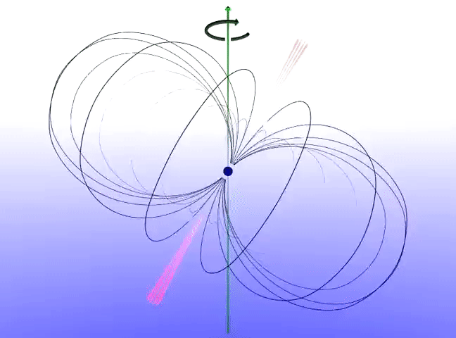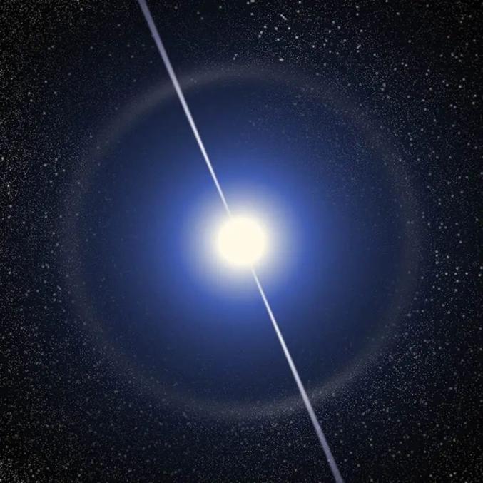中子星通常会从磁极附近发出辐射束,辐射束的方向与磁轴近似一致。当磁轴与自转轴的方向不一致时,辐射束便会像灯塔发出的光柱一样在宇宙空间中不断扫射。当中子星的辐射束恰好扫过地球时,我们就可能观测到它的辐射信号。这种中子星就被称作脉冲星,有时也被叫作“宇宙灯塔”。