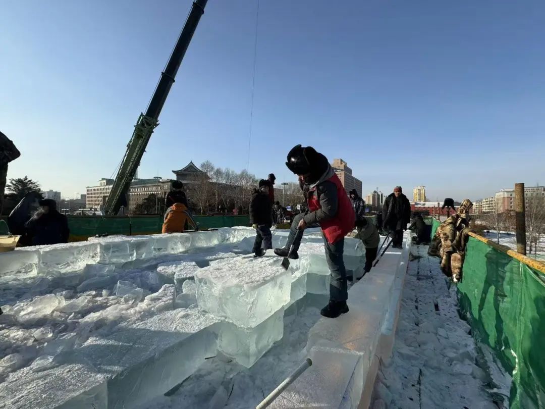 施工队队长林金山介绍,目前新民大街现场共有76名冰雕师在紧张施工,随着冰雕基础的搭建完毕,现场冰雕师的数量将增加到120余人。预计12月28日,冰雕作品将全部完工。