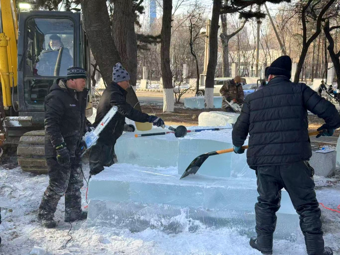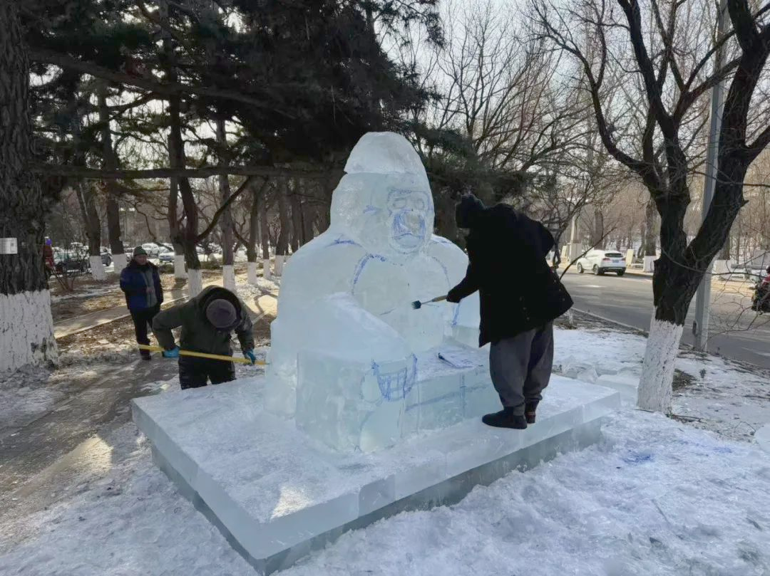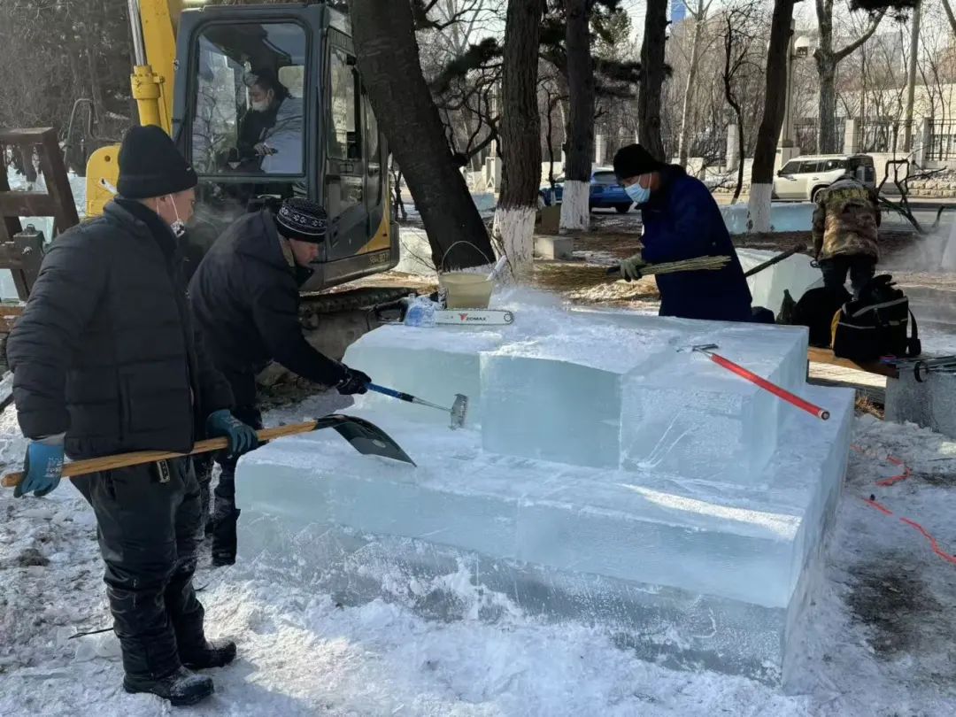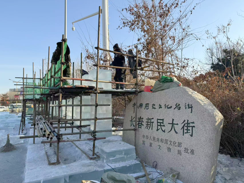 在文化广场上,一座名为《盛世中华》的大型冰雕正在紧锣密鼓地建设中。这座冰雕以其宏大的规模和精湛的工艺,成为整个新民大街冰雪景观的标志性作品。