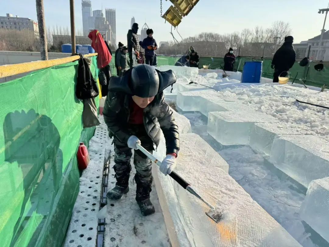 现场30多名冰雕师傅挥动着电锯、冰铲和水舀,将一块块巨大的冰块雕琢成精美的艺术品。吊车缓缓地将冰块吊到顶部,师傅们则小心翼翼地将其拼接、固定。