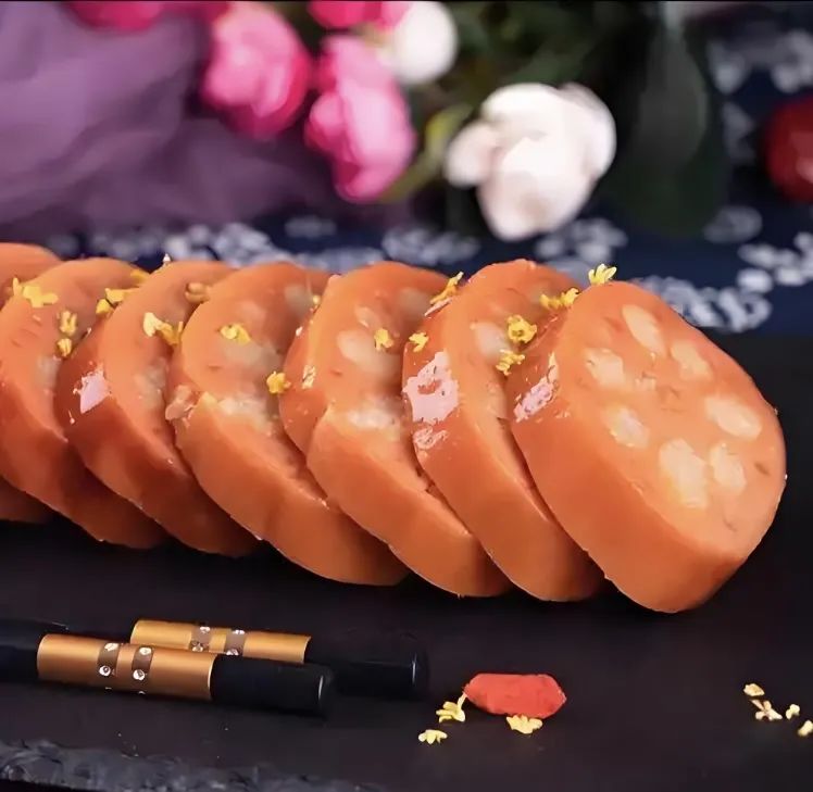 做法:先将莲藕去皮,洗净,沥干,切下藕节一端;糯米洗净,浸泡4小时后沥干,然后糯米中加入白糖拌匀,灌入藕孔中,将切下的藕节放回原位,用牙签固定,最后将藕段用大火蒸1小时,取出切片,摆盘,撒上糖桂花即可。