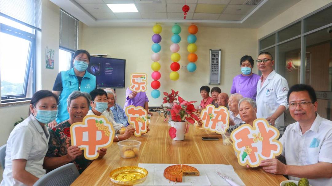 中心的医护人员和老人共度中秋节