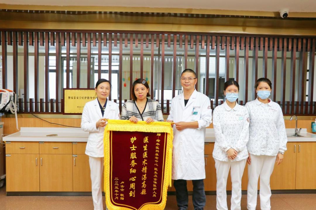 在中心的护士台墙壁上,一面印有“医生医术精湛高超,护士服务细心周到”字样的锦旗格外引人注目。这面锦旗是卢女士为感谢中心对其父亲的精心照料而赠送的。