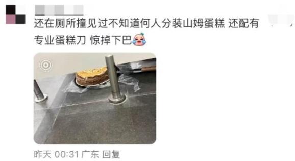 但根据目前已知情况来看,没有证据判断是该照片展示的场景,是本人购入蛋糕进行切块分装还是代购分装。不过,甭管是不是代购,在厕所切蛋糕这事儿,听起来就让人觉得很不可思议。