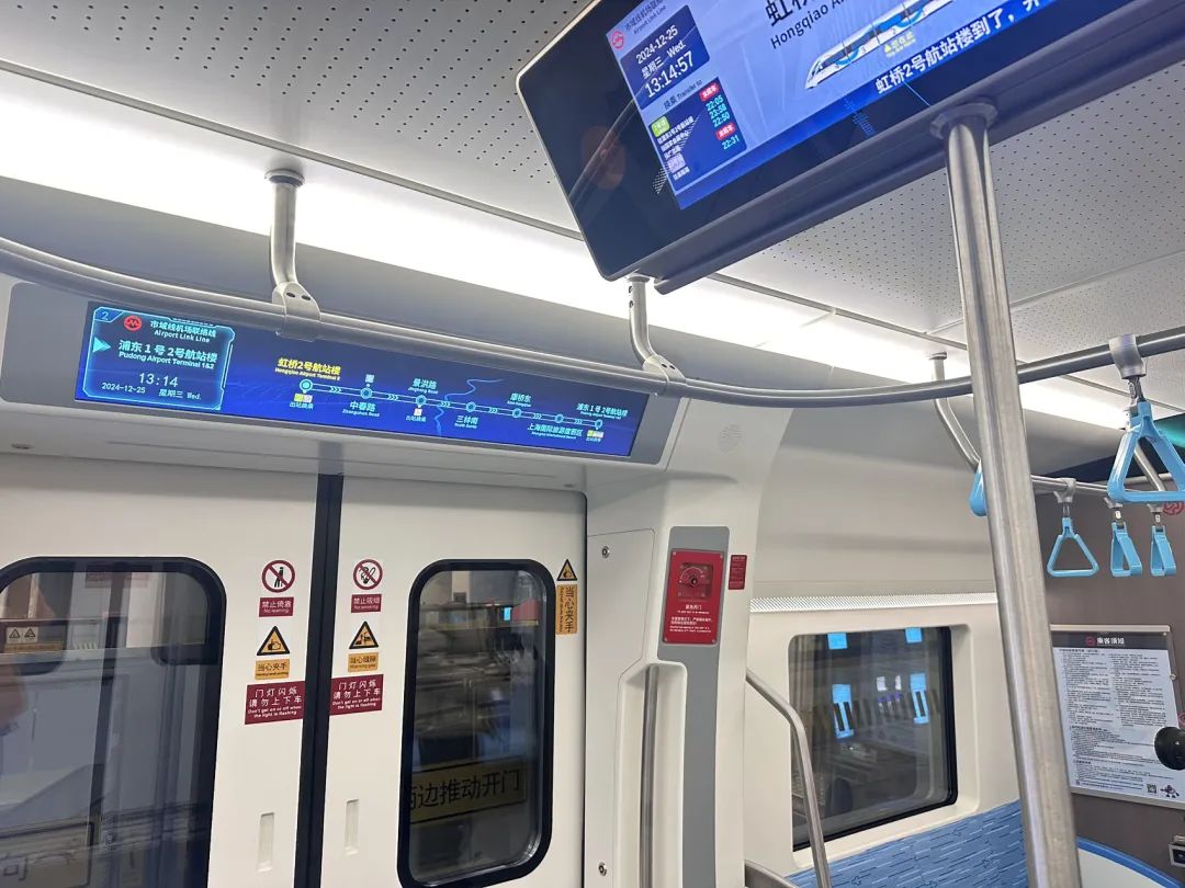 13:14,记者从虹桥2号航站楼登上了开往浦东1号2号航站楼站方向的市域机场线的列车,列车缓缓启动,平稳地行驶在轨道上。