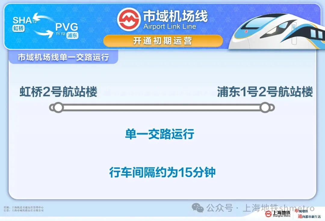根据运行计划安排,市域机场线开通初期运营后,全天开行“虹桥2号航站楼站至浦东1号2号航站楼站”的单一交路。行车间隔15分钟左右。