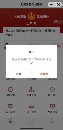 点击“审判立案”界面会出现是否愿意接受调解。如果您愿意接受第三方调解,请您选择“愿意”,进入“多元调解”小程序申请调解;如果您想要直接立案,请您选择“不愿意”,进入立案页面,点击“审判立案”进行诉讼立案。