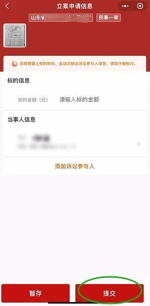 上传起诉状、当事人身份证明、证据材料等材料后,系统将自动识别诉讼参与人的信息和标的金额,请您务必仔细核对标的信息和当事人信息。点击“待补全”,增补或更正有关信息后,点击保存并提交。如有未识别出的诉讼参与人,点击“参加诉讼参与人”增补信息后,进行保存。