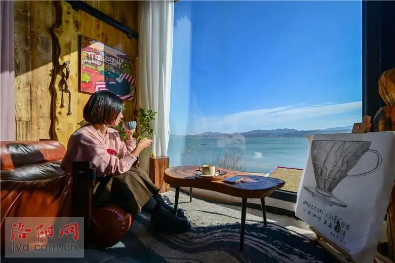 日前,在嵩县陆浑湖西岸情绪咖啡店内,游客品咖啡赏湖景,乐享休闲慢时光。