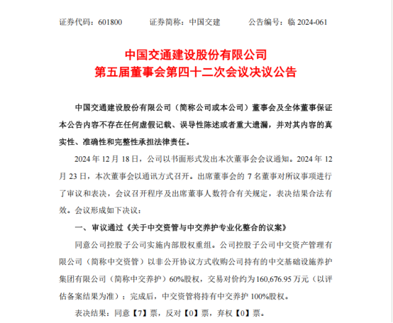12月24日,中国交通建设股份有限公司(以下简称“中国交建”)发布第五届董事会第四十二次会议决议公告。公告称,中国交建于2024年12月23日召开董事会,审议通过《关于中交资管与中交养护专业化整合的议案》,同意中国交建控股子公司实施内部股权重组。中国交建控股子公司中交资产管理有限公司(以下简称“中交资管”)以非公开协议方式收购中国交建持有的中交基础设施养护集团有限公司(以下简称“中交养护”)60%股权,交易对价约为160,676.95万元(以评估备案结果为准);完成后,中交资管将持有中交养护100%股权。
