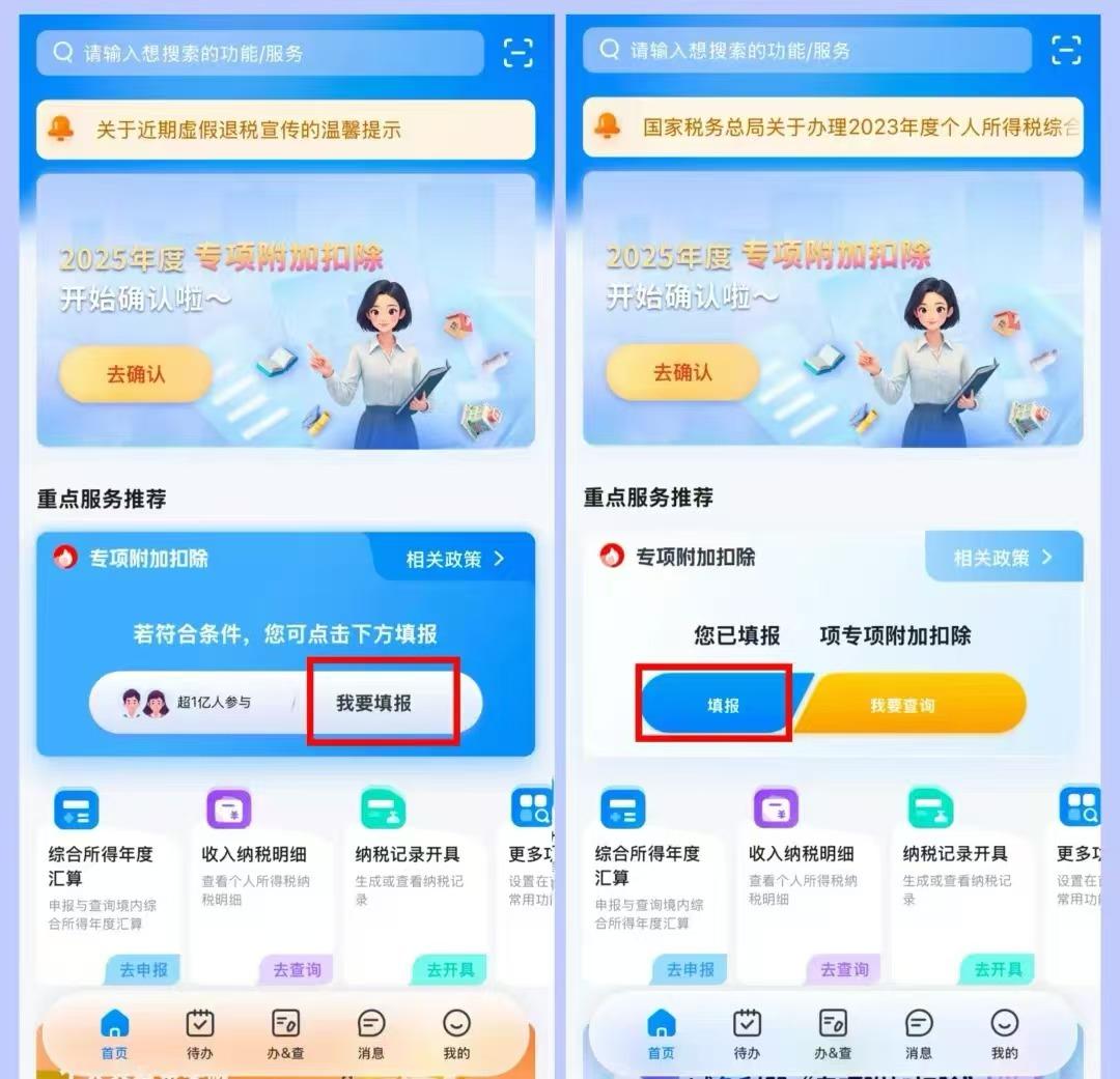 答:点击个人所得税App首页-重点服务推荐-【我要填报】或【填报】,进入专项附加扣除功能页面。