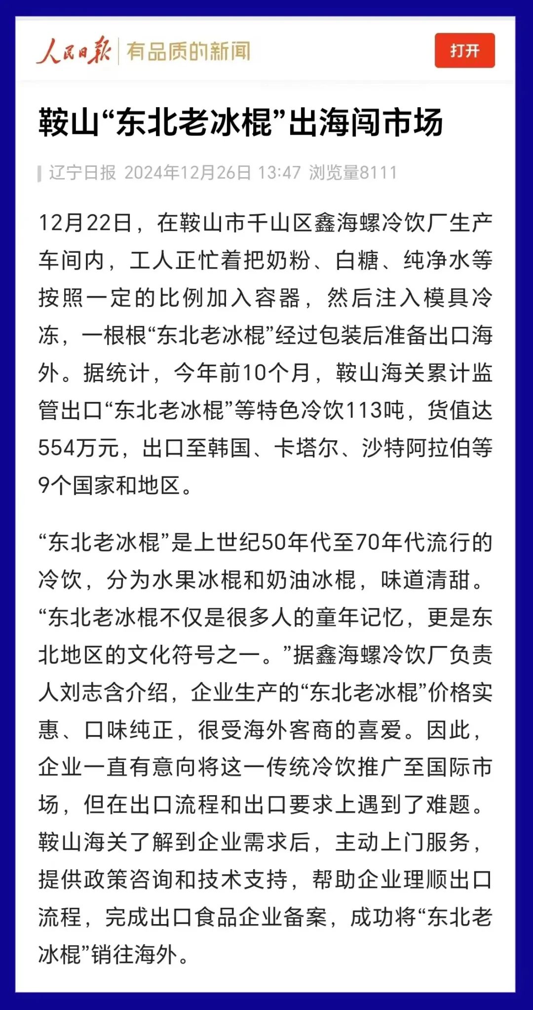 原标题:《央媒看鞍山丨人民日报客户端:鞍山“东北老冰棍”出海闯市场》