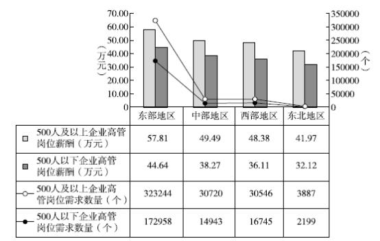 从不同地区对高管猎头职位提供薪资行业对比情况来看(如图1所示),500人及以上的企业对高管职位需求数量都高于500人以下的企业,且东部地区500人及以上的企业和500人以下的企业对高管职位的需求数量差异最大。