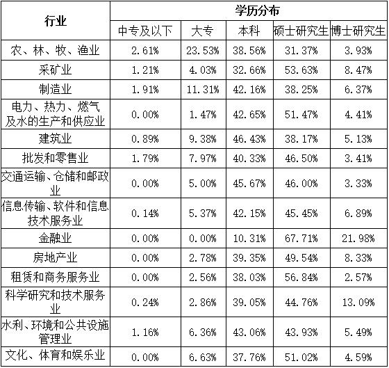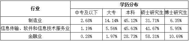从同行业大型企业、中小型企业对比来看,制造业、信息传输、软件和信息技术服务业、金融业大型企业高学历(硕士及以上)占比均高于中小型企业。