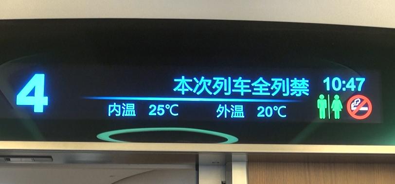 每节车厢连接处上方有一块信息显示屏,显示车次、车厢号、内外温度、时间、卫生间使用情况等信息。