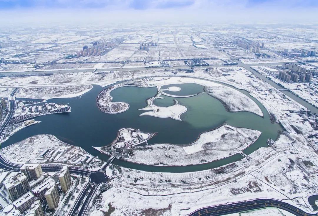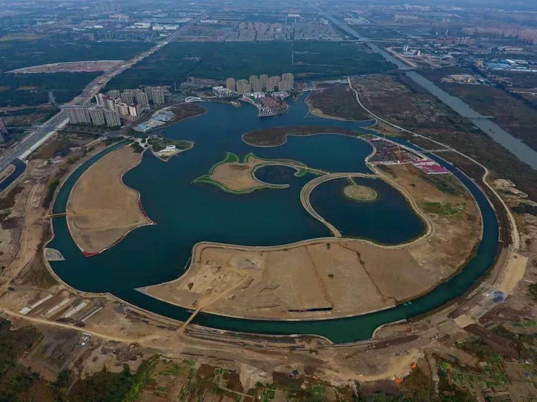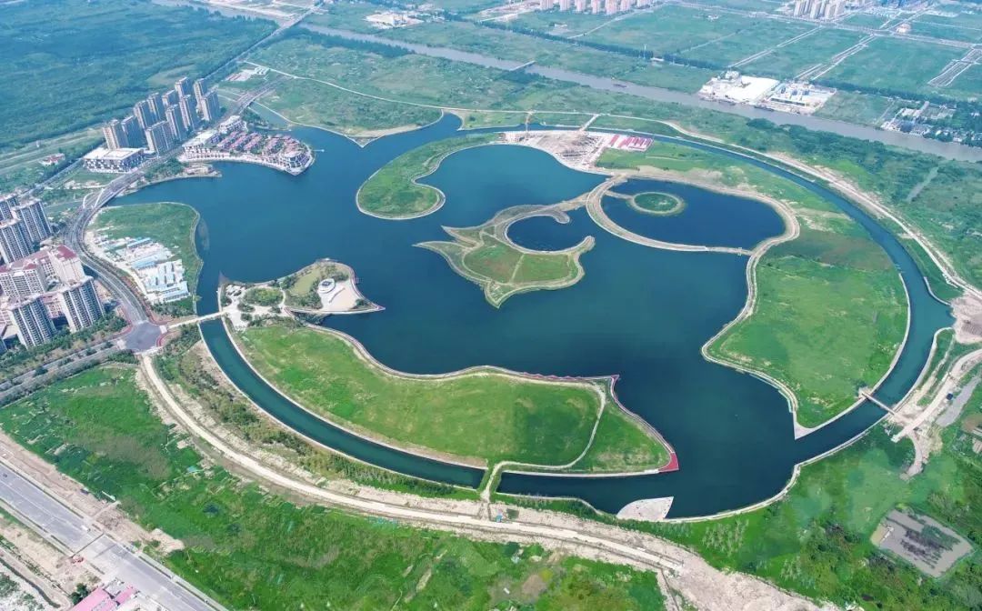 2016年5月,金海湖湖面工程基本完工并完成蓄水,灵动的鱼形湖面跃然“浮出水面”。同年3月,位于金海湖西岸的首座公园“年丰公园”破土动工。