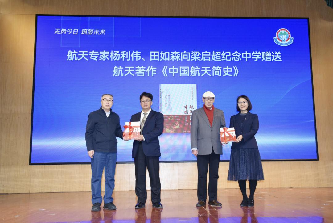 现场还播放了梁启超纪念中学素质教育成果宣传片,汇报了该校的办学成果,向获奖教师、校友颁奖。该校获赠航天著作等书籍,以及纪念牌等纪念品。校友现场向学校捐赠资金,用实际行动支持母校发展。