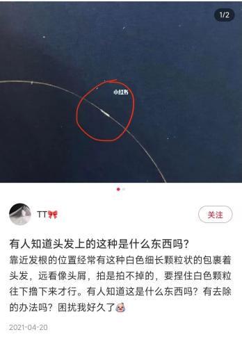有一部分很细心的人,在对着镜子仔细观摩自己的头发后,发现有一些白色的、细长的不明物体包裹着自己的发丝,看着不像头屑,要顺着发丝捏下来才能弄掉。