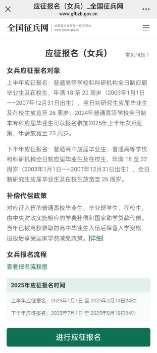 上半年应征报名:普通高等学校和科研机构全日制应届毕业生及在校生,年满 18 至 22 周岁(2003年1月1日——2007年12月31日出生),全日制研究生应届毕业生及在校生放宽至 26 周岁;2024年普通高等学校全日制本专科应届毕业生可以报名参加2025年上半年女兵征集,年龄放宽至 23 周岁。