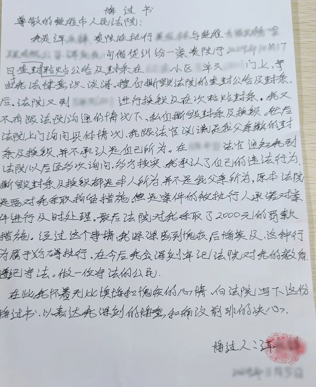谭某乙对自己的行为深感悔恨,当场写下悔过书,缴纳罚款。