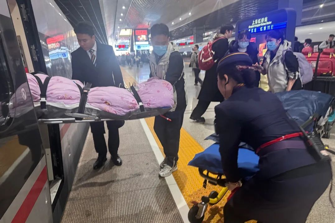 12时51分,列车到达上海虹桥站。旅客家属向列车长及乘务员表示衷心的感谢:“你们的服务细致入微,太贴心了!真的感谢你们。”