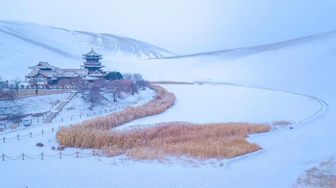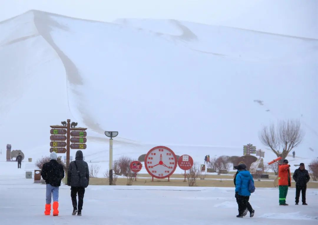 1月9日晚,敦煌市降下2025年的第一场雪。雪后大漠风光旖旎,犹如披上薄薄的轻纱,敦煌鸣沙山月牙泉景区雪景如画,吸引众多游客前来观赏难得一见的大漠雪景。