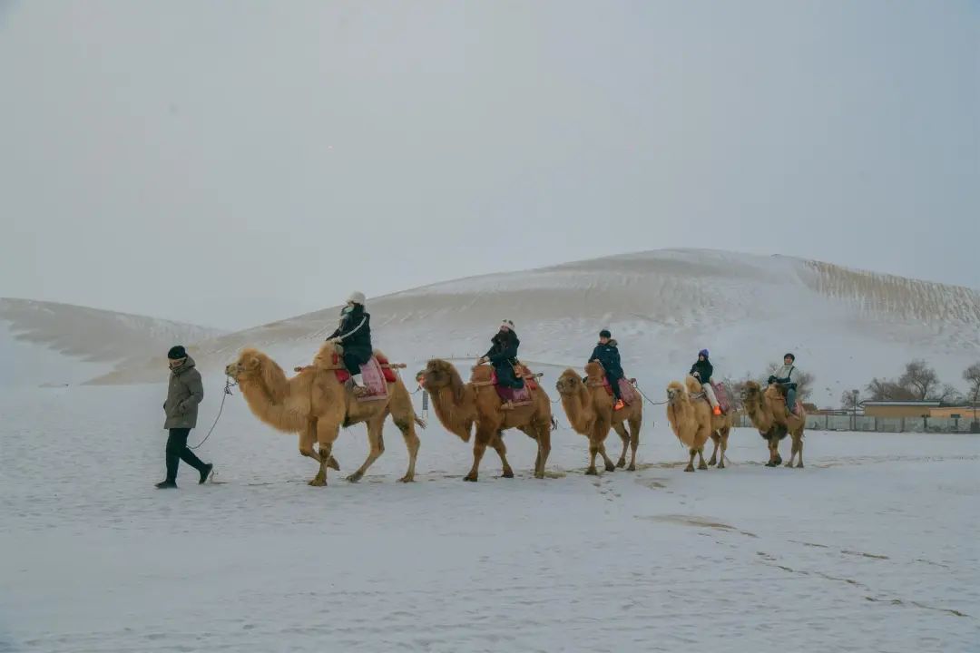 1月10日,游客骑骆驼观赏难得一见的大漠雪景。继续滑动看下一个轻触阅读原文