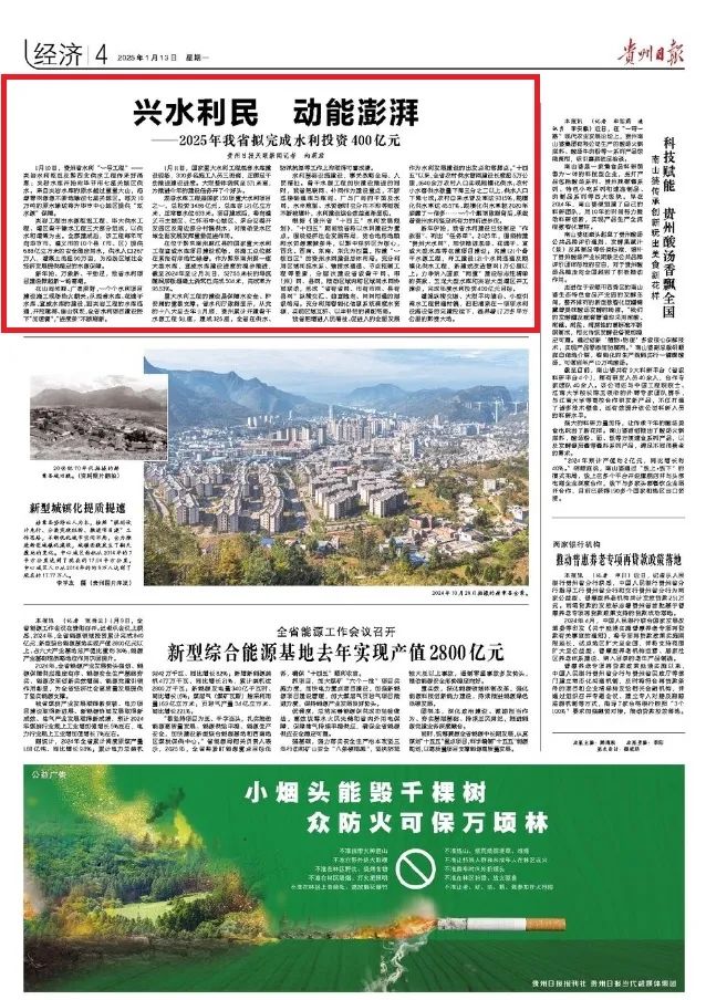 新年伊始,我省水利建设已经制定“作战图”、列出“任务单”。2025年,围绕构建“贵州大水网”,加快推进观音、花滩子、宣威大型水库等在建项目建设;完建121个骨干水源工程,开工建设121个水网连通及规模化供水工程,新建或改造管网1万公里以上;力争纳入国家“两重”建设标志性清单的英武、玉龙大型水库和夹岩大型灌区开工建设,完成年度水利投资400亿元目标。